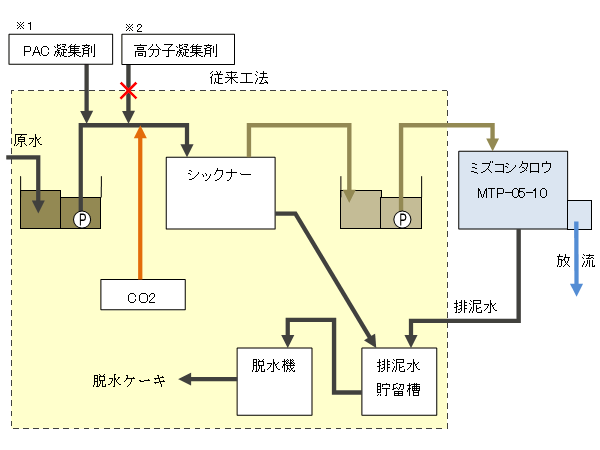 トンネル工事で発生する濁水処理において従来技術の凝集沈殿方法とミズコシタロウを組合わせた