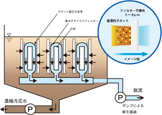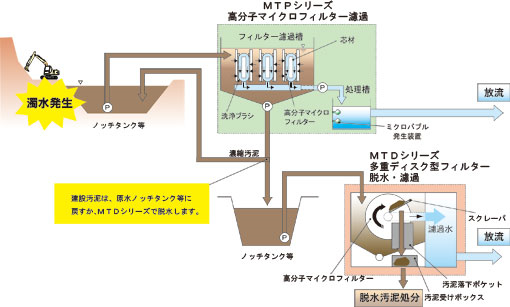 ■濁水処理のイメージ図 発生した濁水をノッチタンク等に貯め、そこからフィルターろ過槽へ流入し、高分子マイクロフィルターろ過によって濁水を物理的にろ過処理し放流します。フィルターろ過槽内では汚泥が濃縮していくので、定期的に原水ノッチタンク等へ戻すか、別製品のMTDシリーズで脱水処理します。 |