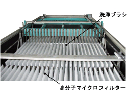 高分子マイクロフィルターの目詰まりを防ぐために、定期的にブラシ洗浄が自動で行われます。また、様々な現場の濁水に対応できるように洗浄回数や洗浄時間を設定することも可能です。 |